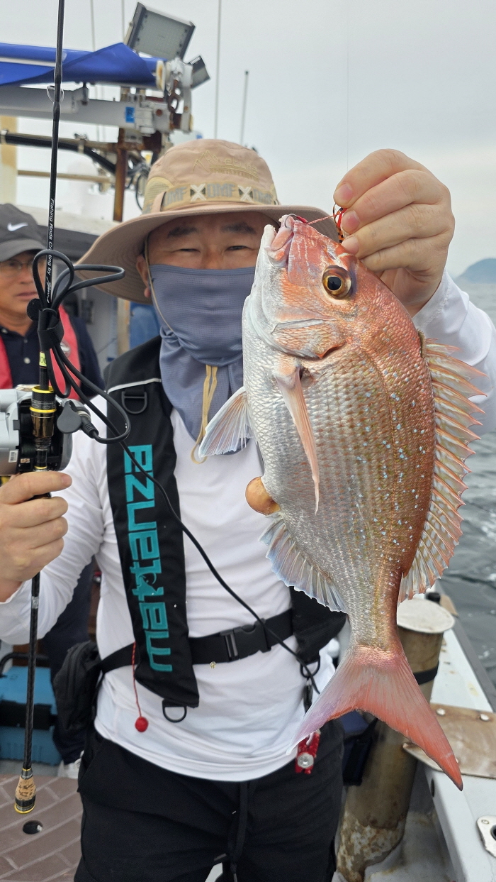 묵직한 손맛에 몇 차례 드랙이 풀려나가며 참돔의 저항이 시작되었고 수면 위로 붉은 빛깔의 40cm급 참돔이 올라왔다.