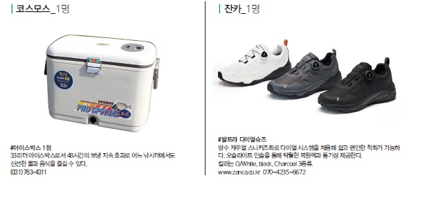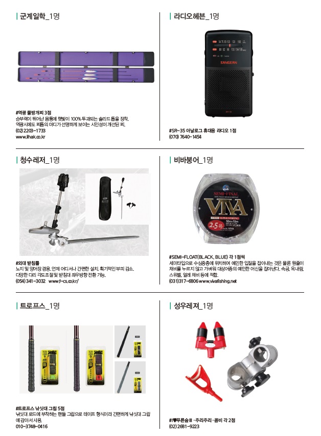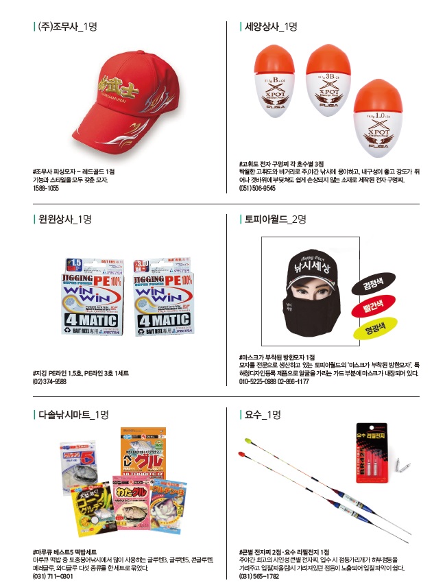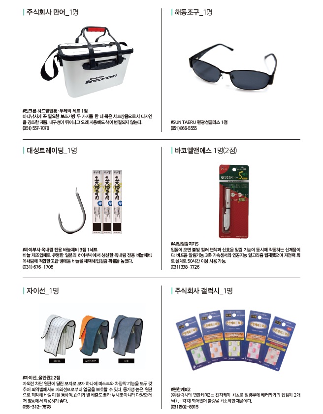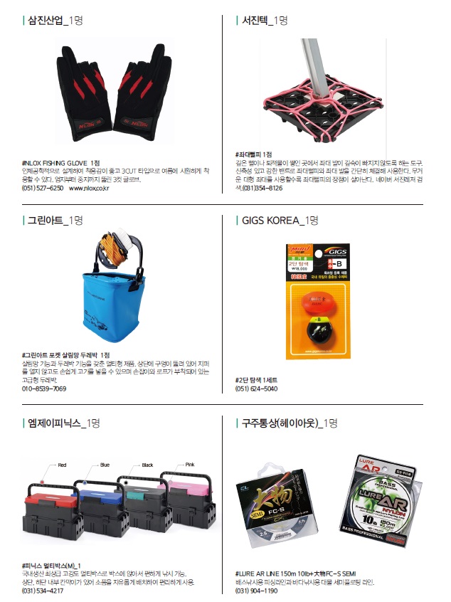 ▶ 당첨 상품 중 다솔낚시마트 떡밥 세트, GIGS 탐색찌, 피싱그룹만어 밑밥통·두레박 세트, 하야부사 옥내림바늘 세트, 군계일학 역광 물방개찌는 협찬사에서 직접 우송합니다.