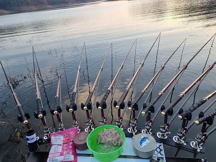 출조 전 알아보니 안동호 수위는 만수위의 50% 수준이었고 하루에도 1~2cm의 배수가 진행 중이었다. 특히 올해는 심각한 가뭄으로 육초가 무성하게 자라 깔끔한 바닥을 찾기 어려웠다. 오후 3시경 현장에 도착해 좌대를 설치하고 대편성을 시작했다. 한 대씩 한 대씩 채비를 던져 넣으며 깨끗한 바닥을 찾아나갔다. 환절기인 만큼 어떤 미끼가 잘 먹힐지 몰라 지렁이, 글루텐, 옥수수 등을 고루 준비했다.