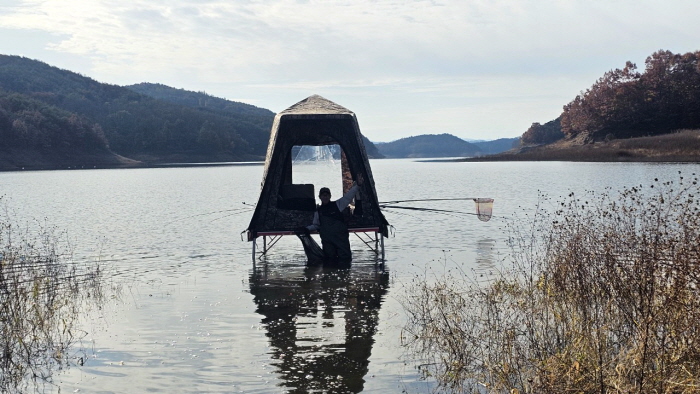 저수위로 얕아진 수심을 감안, 물 속에 좌대를 설치하고 수중전을 펼치고 있는 낚시인들.