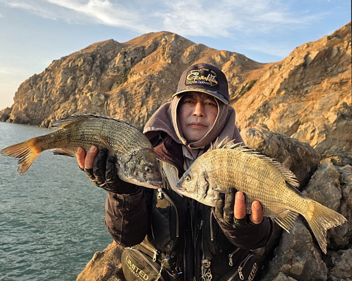곽성준 씨가 다라섬 맞은편 작은여에서 올린 45cm 감성돔 2마리를 보여주고 있다.