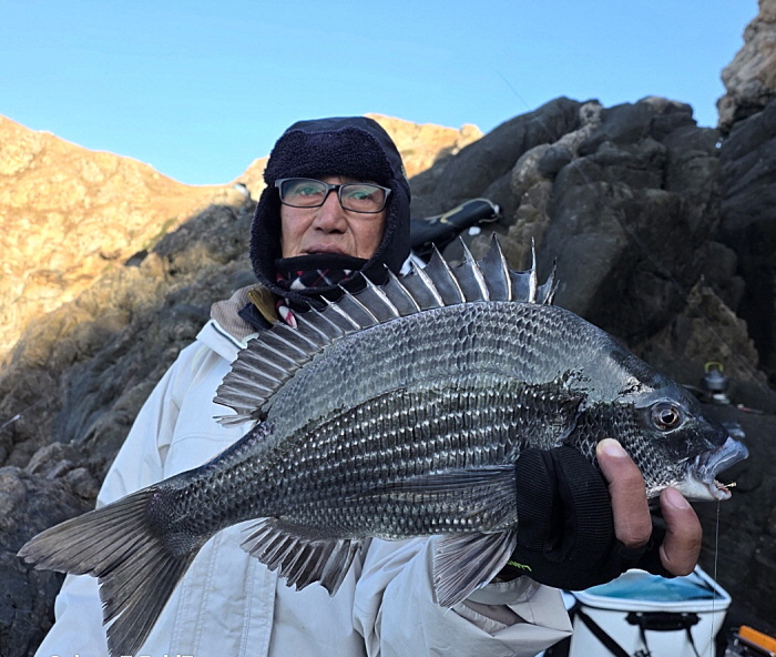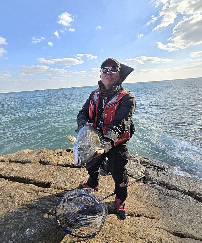 장안여 뒤편에 내렸던 김상범 씨가 방금 올린 45cm 감성돔을 자랑하고 있다.