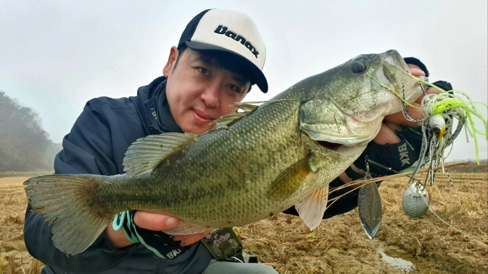 나는 스피너베이트로 교체 후 탐색을 시작했다. 수로의 우안으로는 이승혁, 권태왕 씨가 진입했고, 나와 강민경 씨는 좌안을 따라 내려갔다. 그러던 중 수면에 거품이 있는 곳을 발견했다. 배스가 먹이 활동을 했다는 증거였다. 그곳에서 수로 중앙까지 스피너베이트를 캐스팅한 후에 바닥까지 내려 천천히 리트리브를 몇 회 반복했다. ‘덜컥!’하는 느낌에 녀석을 제압하니 배스였다. 그렇게 나는 마수걸이를 기록했다.