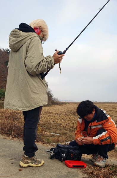 11월 30일 아침에 취재팀은 신년호 취재를 위해 대요리수로(지곡면 대요리 1157)에 집결했다. 이번에는 이승혁, 강민경 부부 외에 권태왕 씨도 처음으로 함께했다. 이승혁 씨와 권태왕 씨는 프로 리그에서 오랜 기간 활동한 그야말로 ‘고인물’같은 실력자들이고, 강민경 씨 역시 오픈전에 수없이 참가한 전력이 있는 실력자다. 보팅뿐 아니라 워킹낚시도 즐겨하는 분들이기에 더더욱 그렇다.