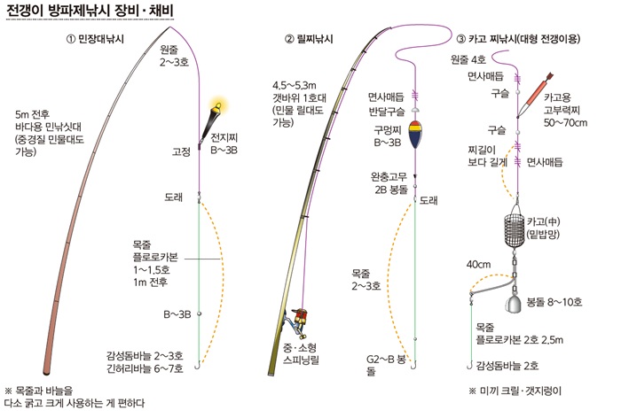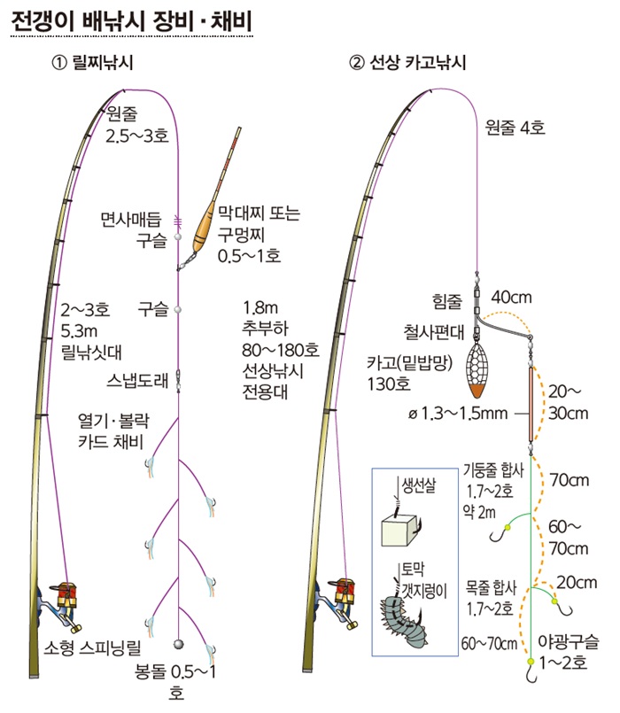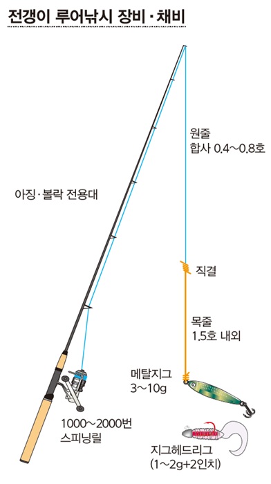 한편 좌대에서는 2~3m 길이의 루어대나 짧은 릴대를 사용한다. 통영권 좌대낚시터의 경우 장비를 대여하고 있으므로 따로 준비하지 않아도 된다.