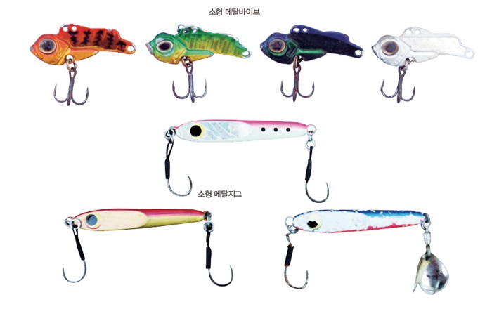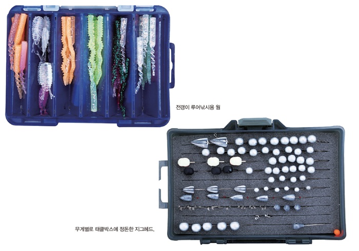 아징용 지그헤드에 아징용 웜을 꿴 지그헤드리그가 기본이다. 그밖에 메탈지그도 쓴다. 웜의 크기는 2인치, 메탈지그는 3~10g 내외가 적당하다. 전갱이용 웜은 꼬리 끝이 가는 핀테일이 잘 먹힌다.