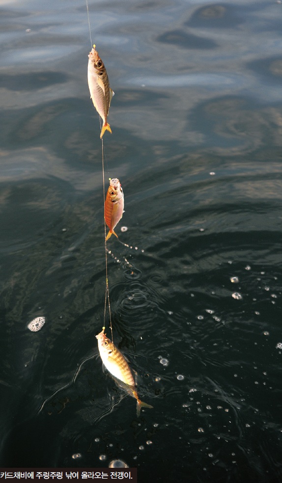 경남 거제, 통영에 있는 가두리 양식장 주변의 좌대는 대표적인 전갱이 가족낚시터다. 양식장 안의 물고기를 낚는 것이 아니라 가두리 양식장에서 흘러나가는 사료를 먹기 위해 몰려든 전갱이를 낚는 것이다. 낚싯대는 2~3m 길이의 연질 릴대를 쓴다. 전갱이의 활성도가 높을 때는 가지바늘채비를 써서 한 번에 두세 마리씩 낚아 올리고 겨울에는 전갱이용 편대채비를 사용해 한 마리씩 낚아낸다. 전갱이가 바닥 근처에서 입질을 하기 때문에 채비를 바닥으로 가라앉힌 뒤에 3m 정도 띄워서 낚는 것이 요령이다.