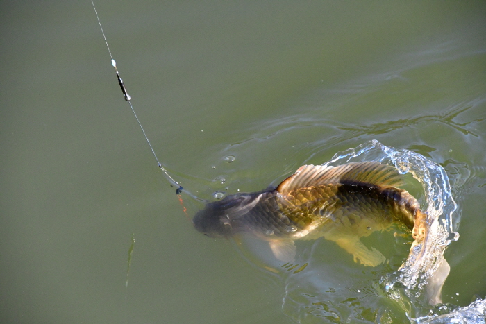 발밑까지 끌려온 향붕어가 마지막 저항을 하고 있다. 반제낚시터에는 씨알 굵은 향붕어가 많아 진한 손맛을 즐길 수 있다.