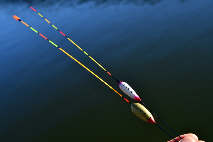 취재일 사용한 찌들. 왼쪽이 전자케미를 상단에 부착하는 군계일학 빼찌빵 역광찌, 오른쪽이 찌톱 전체에 불이 들어오는 물방개 스텔라다.