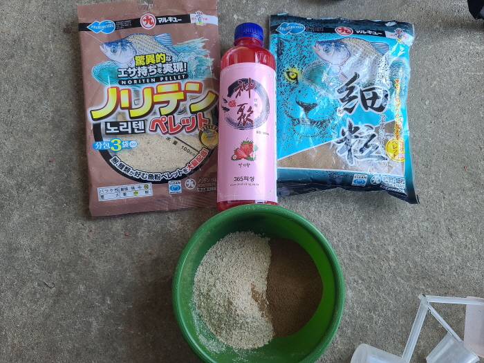 취재일 사용한 미끼. 마루큐의 노리텐과 입전소립, 365피싱의 신취(딸기) 물약을 첨가해 사용했다.