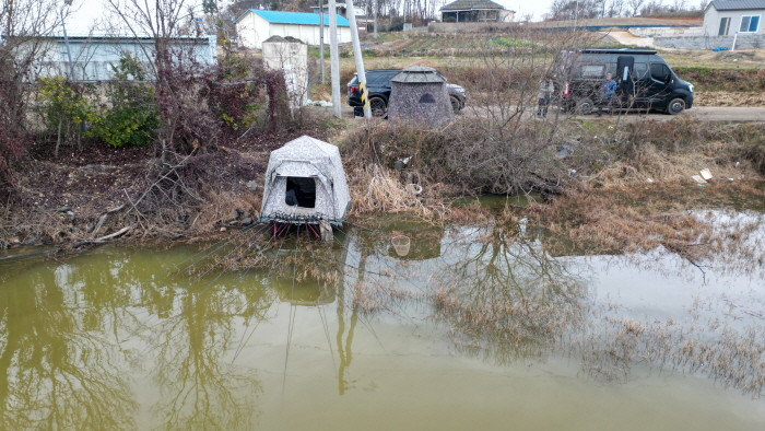 낚싯대 1대만 들고 수심을 체크해 보니 상류권이 1~1.2m, 양수장 뒤쪽으로는 1.4m 정도의 수심이 나왔다. 겨울에는 조금이라도 수심이 깊은 곳이 나을 듯해 양수장 뒤쪽에 자리를 잡았다. 그곳은 뗏장수초가 양쪽 옆으로 잘 발달해 있어 짧은 대부터 긴 대까지 모두 사용이 가능한 곳이었다.