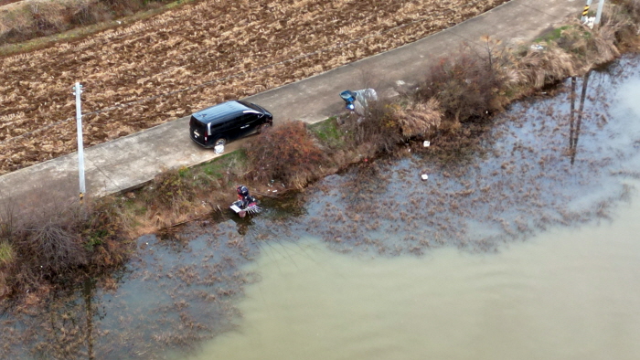 다음 코스로 찾아간 곳은 금지제. 지도상으로 포인트를 살펴보니 겨울 북서풍에 포인트가 완벽하게 의지됐다. 12월 23일 오전에 도착하니 아무도 없었다. 도로도 잘 포장되어 있어 주차가 편했고 무엇보다 연안으로 뗏장수초가 길게 띠를 이루고 있어 포인트 여건이 뛰어났다. 특히 강한 북서풍에도 양수장 건물이 바람을 막아주고 ‘차 대고 5보’ 이내라 짐 많은 필자로서는 너무 마음에 들었다.