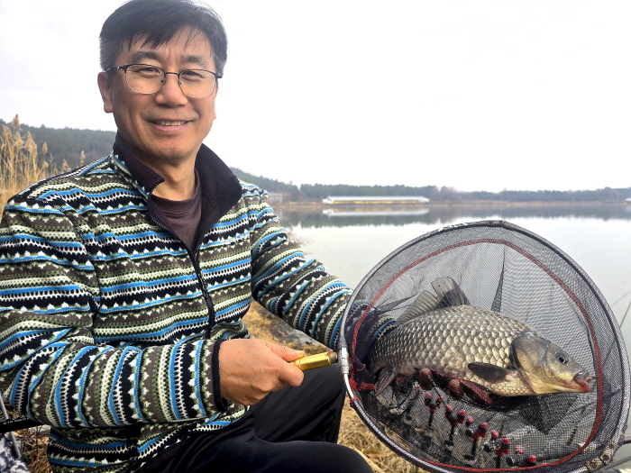 3칸부터 6칸까지 한 대 한대 펴고 있는데 옆자리에 앉았던 노승우 회장의 자리에서 “쒸~잉”하며 챔질 소리가 나 돌아보니 낚싯대가 활처럼 휘어진 게 보였다. 제법 큰 씨알의 붕어 같았다. 뜰채에 담겨진 붕어는 28cm급이었다.
