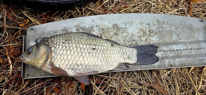 그 사이, 필자의 낚싯대에도 언제 입질이 왔었는지 찌가 사선으로 누워 끌려가고 있었다. 반사적으로 챔질하자 힘이 장난이 아니었다. 째는 힘이 허리급 월척 수준의 대단한 파워였다. 그러나 한참의 실랑이 끝에 올라온 녀석은 29cm에 불과했다. 보통의 낚시터와는 다르게 붕어의 힘이 대단했다. 배스 유입 후 붕어의 체고 또한 높아진 듯 보였다.