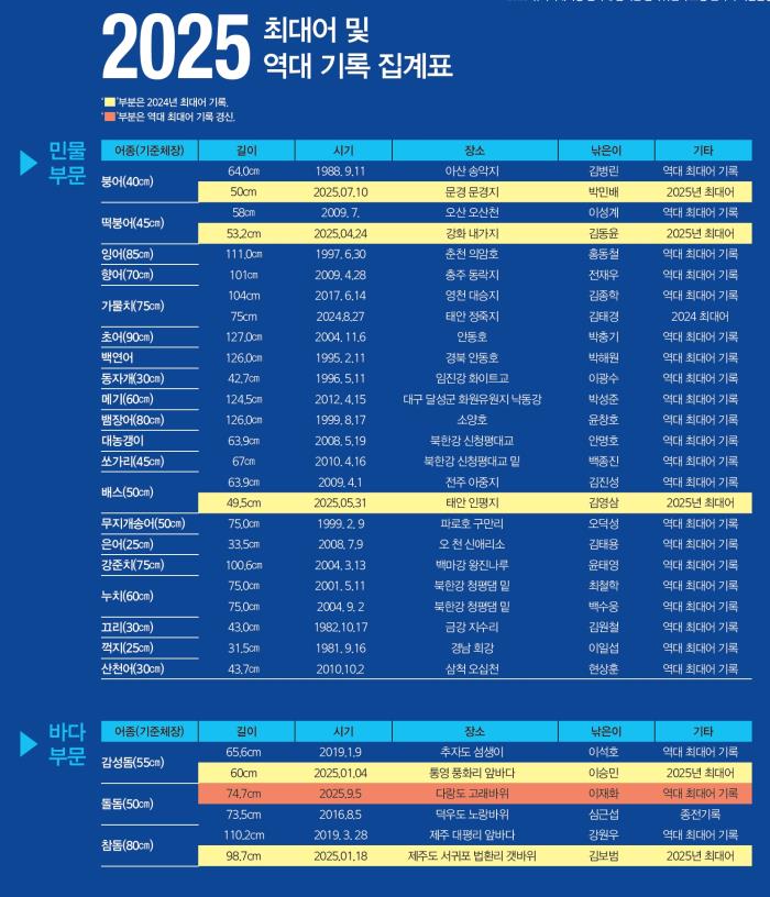 부진했던 2025년 조황에도 불구 바다 부문에서 5개 어종이 신기록을 경신한 것은 고무적이었다. 넙치(광어), 삼치, 전갱이, 참다랑어, 돌돔이 주인공으로, 대다수가 루어낚시로 올린 것들이다. 그만큼 바다 루어낚시의 인기가 시간이 갈수록 뜨거워지고 있다는 사실을 알 수 있었다.