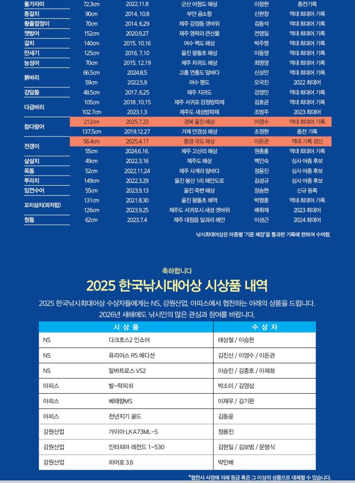 그 밖의 연간최대어는 다음과 같다. 감성돔은 이승민 씨가 낚은 60cm(61cm로 접수), 넙치농어는 정용진 씨가 낚은 95.8cm(98cm로 접수), 방어는 김현일 씨가 낚은 106cm(110cm), 볼락은 박소미 씨가 낚은 32cm(33cm로 접수), 부시리는 김기완 씨가 제주 화북 앞바다에서 낚은 161cm(164cm로 접수), 삼치는 태상철 씨가 경주 전촌 앞바다에서 낚은 131cm(133cm로 접수), 조피볼락(우럭)은 문명식 씨가 완도 사수도 해상에서 낚은 68.5cm(69cm로 접수), 참돔은 김보범 씨가 제주 서귀포 번환리 갯바위에서 올린 98.7cm(100cm로 접수)가 2025년 연간 최대어에 선정됐다.
