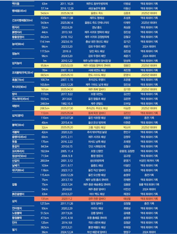 넙치는 김진산 씨가 동해 묵호 앞바다에서 올린 112cm가 역대 기록을 경신했다.