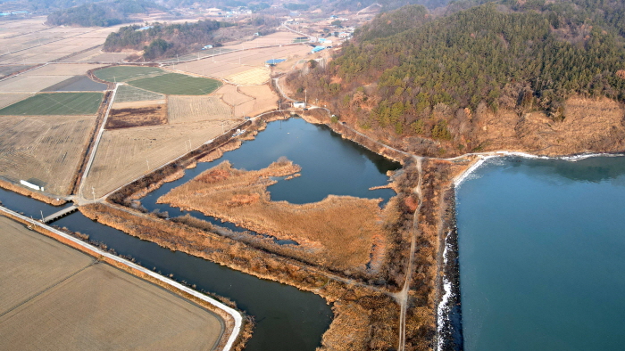드론으로 촬영한 고흥 거군지. 제방이 바다와 맞닿아 있다. 바닷바람 영향으로 겨울에도 잘 얼지 않는다.