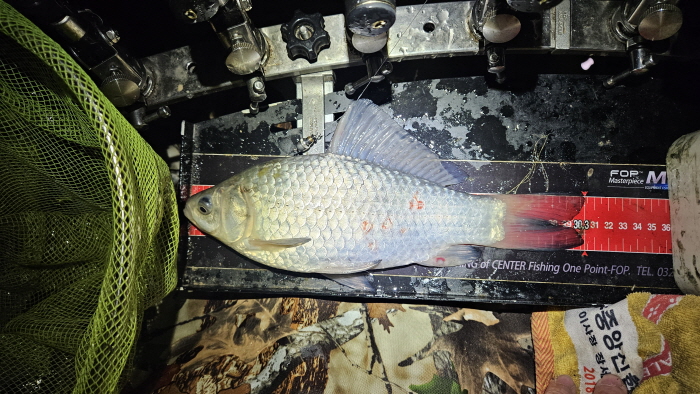 필자는 일행들 옆에 남아있는 빈자리에 짐을 풀었다. 낮에는 입질이 전혀 없었고 찌불을 밝히고 얼마 지나지 않은 저녁 6시20분경, 천류사의 6.0칸 대에 입질이 들어왔다. 미끼는 글루텐. 한 목반 정도 올리는 약한 입질을 놓치지 않고 챔질하니 9치급 붕어가 올라왔다. 이후로 글루텐으로 열심히 집어하자 1시간에서 1시간 30분 간격으로 입질이 들어와 추운지도 모르고 밤낚시를 이어갔다.