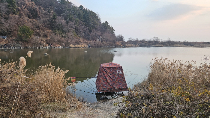 오후 3시경 거군지에 도착해 저수지를 둘러보니 수초가 밀집해 바람을 덜 타는 구간은 얼음이 그대로 남아있었다. A급 포인트로 알려진 산 아래 포인트에는 필자 일행 외의 낚시인 3명이 먼저 들어와 있었다.