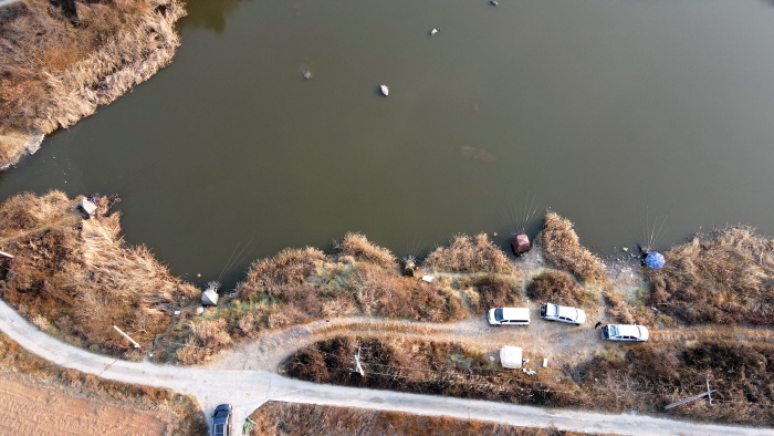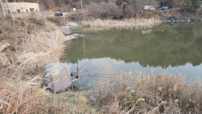 쉽게 녹을 것 같지 않아 포기하고 찾아간 곳은 봉암지 아래 수로. 앞선 탐사 때는 얼음이 얼어서 낚시를 못했는데 바람을 잘 타는 곳이라 그런지 이번에 가보니 싹 녹아있었다. 6대의 낚싯대를 펴고 지렁이와 글루텐으로 2시간 정도 낚시해봤으나 찌는 미동도 없었다. 결국 이동을 결정했고 필자의 지인들이 전날 들어가 낚시 중인 거군지로 향했다.