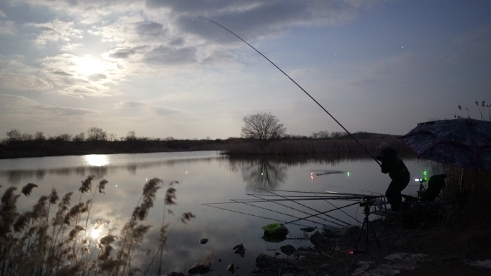초저녁에 입질을 받아내는 장면. 주로 밤에 입질이 활발했다.