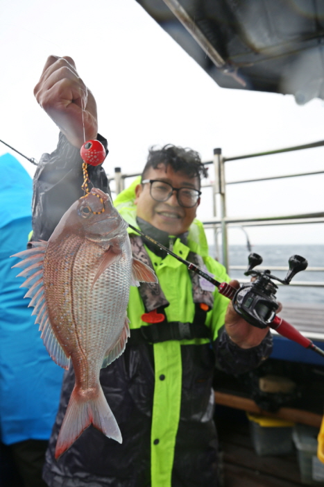 선장실에서 채비를 내리라는 부저가 울렸다. 하지만 비는 더욱 거세게 내렸다. 오전 9시가 되면 비가 그친다는 예보도 믿기 힘들었다. 그런 악조건 속에서 최호경 씨는 타이라바를 내리자마자 첫 참돔을 낚아냈다. 씨알은 30cm급. 연이어 전창현 프로도 비슷한 씨알을 낚아냈다. 참돔의 활성이 좋아 보여 잘만 하면 ‘대박’을 칠 수 있겠다는 기대도 생겼지만 입질은 오래가지 않았다.