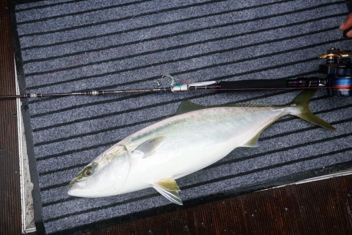 최호영 씨가 낚은 70cm 방어와 사용한 장비. 로드는 마탄자 크레타 버티컬 지깅 B532-P5, 메탈지그는 150g.