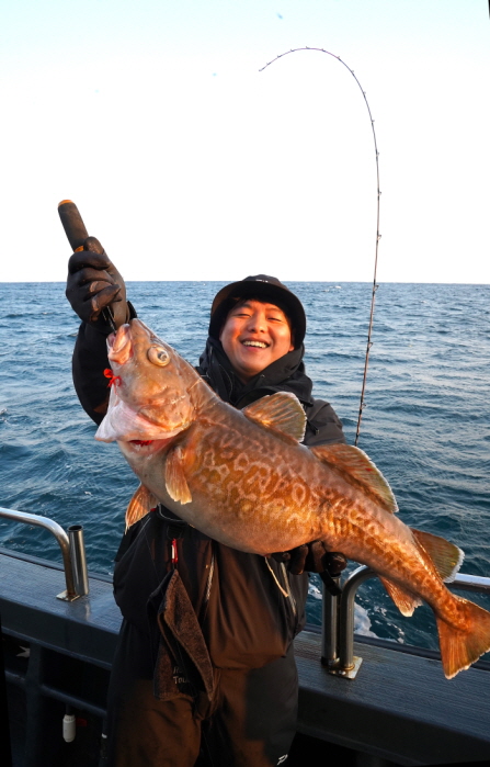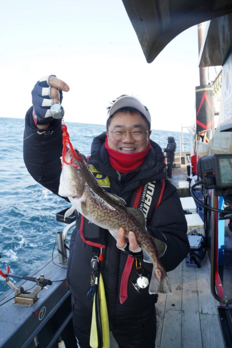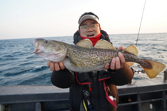 중치급 대구를 낚고 즐거워하는 낚시인.