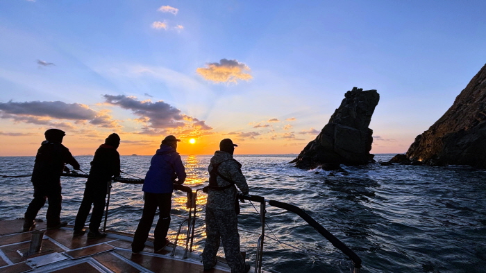 동이 트는 직도 연안에서 농어를 노리고 있는 촬영팀.