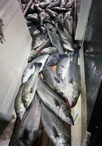철수 후 촬영한 농어 조과. 대부분 타이라바와 지깅으로 낚은 것이다.