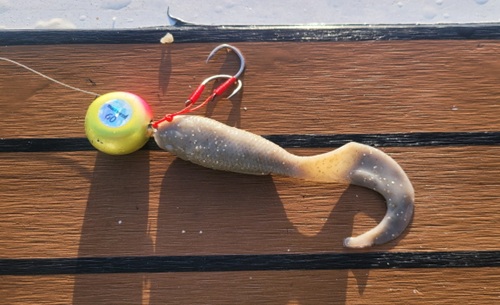 60g 헤드에 바늘과 웜을 체결한 채비.