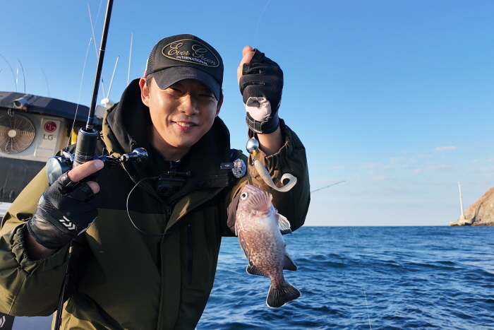 직도에서 조금 떨어져 수심 20m권에서 농어로 추정되는 어군이 모여 있는 곳을 찾았다. 우리는 60g 타이라바 헤드에 버클리 뮬렛 웜 4.5인치를 체결해 바닥층을 노렸다. 그러자 곧바로 임인빈 씨의 로드에 어신이 들어왔다. 첫수는 40cm가 넘는 씨알 굵은 우럭. 곧 마이크로닷의 로드에도 어신이 들어왔다. 이번엔 70cm급 점농어가 올라왔고 연이어 입질이 이어졌다. 미터급이 아니라 아쉽기는 했지만 자잘한 씨알부터 70~80cm 농어가 계속 입질해 손맛을 실컷볼 수 있었다.