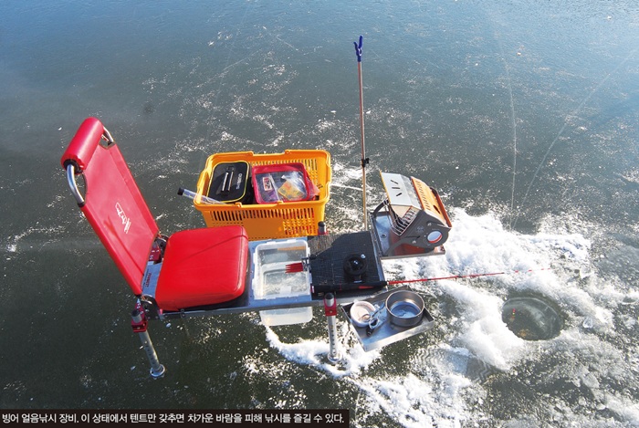 얼음판에서 장시간 낚시하려면 의자가 필수다. 기왕이면 방석 같은 보온재를 준비하면 더욱 따뜻하게 낚시를 즐길 수 있다.