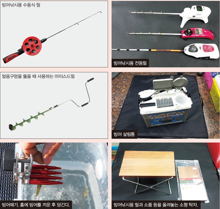 얼음판에 구멍을 낼 때 필요한 장비다. 유료낚시터에서는 관리인이 직접 뚫어주기도 해 얼음끌이 필요 없는 곳들도 있다. 그러나 일반 저수지나 댐처럼 관리인이 없는 곳에서는 직접 얼음을 뚫어야 하므로 끌이 필요하다. 아이스드릴은 회전식 드릴로 얼음구멍을 뚫는 장비다. 빙어는 소리에 민감해 얼음끌로 쿵쿵 찍으면 이내 포인트를 벗어나버린다.