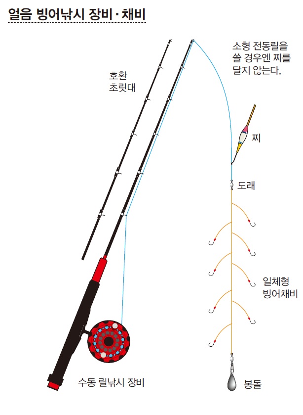빙어는 유영층을 빨리 파악하는 게 급선무이므로 수심이 깊을수록 채비도 긴 것을 사용해야 넓은 범위를 쉽게 파악할 수 있다. 보통 바늘 5~7개짜리는 전체 길이가 50~70cm, 10개짜리는 120~160cm인데 보통 3m 이내 수심이라면 5~7개짜리 채비를 사용하면 된다. 국산 제품은 2천5백~3천원, 일산 제품은 3천5백~4천5백원이다.