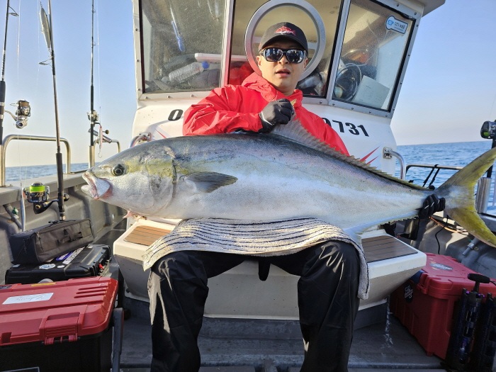 오전 9시30분, 내 예상이 적중했는지 펜슬을 때리는 ‘퍽’하는 입질이 들어왔다. 히트와 동시에 스풀이 역회전했고 부시리는 먼바다로 내달리기 시작했다. 제주에서 120cm가 조금 넘는 놈을 낚은 경험이 있지만 입질 받은 녀석은 그 이상임을 직감했다. 초반에는 도저히 제압할 수 없어 장기전으로 방향을 전환. 15분간 버티기에 들어갔고 마침내 수면으로 떠오른 부시리를 마주할 수 있었다. 랜딩이 끝나자 온몸에 힘이 빠졌고, 말로 표현하기 힘들 만큼 기쁘고 행복했다.