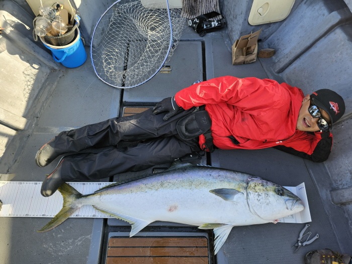 지난 1월 17일, 필자가 제주 서귀포 대평 앞바다에서 200m 다이빙 펜슬베이트로 낚아낸 156cm 부시리를 들고 기념 촬영했다.