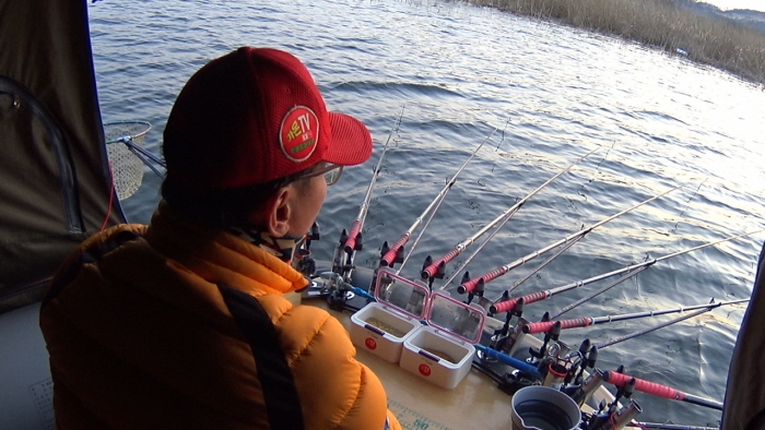 2월 27일 금요일 오후에 보트낚시 동호회 운칠기삼 회원들과 현지에 도착하니 이미 연안 곳곳에 낚시인들이 있어 보트를 펼 자리가 없었다. 보트 론칭은 커녕 주차할 곳도 마땅치 않은 상황. 하는 수 없이 200m가량 ‘짐바리’를 해 어렵사리 보트를 론칭할 수 있었다. 준비해온 수육으로 저녁을 먹은 후 회원들과 함께 포인트로 진입했다. 취재일 우리가 낚시한 곳은 항아리 포인트의 외곽 수초지대였다.