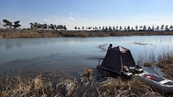 바람이 약간 불기는 했지만 날씨도 포근하고 햇살이 좋았다. 동행한 김복용 씨는 필자의 오른쪽 갈대 사이 포인트에 앉아 자리를 잡았다. 약간 둑 아래 포인트라 바람을 덜 탔다. 그래서 그곳에 본부석 텐트를 설치하고 식사를 준비했다.