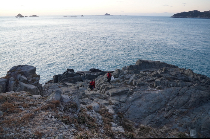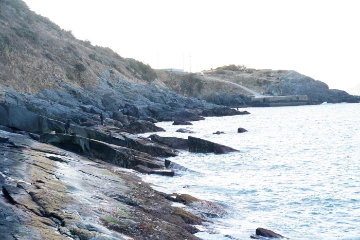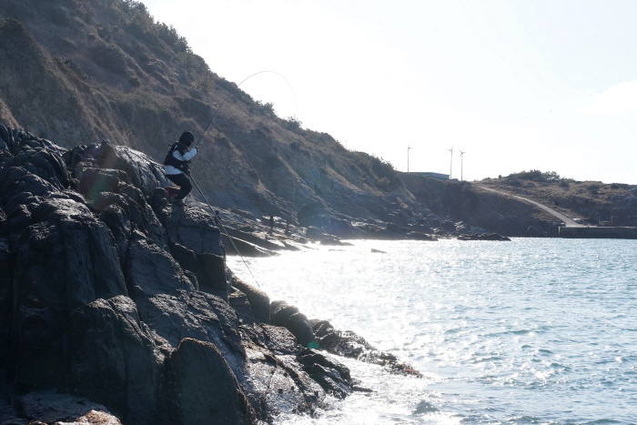 취재팀이 낚시한 남쪽 높은자리에서 바라본 선착장 방면 갯바위. 튀어나온 곳곳이 포인트다.
