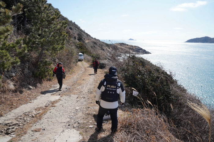 이날 우리가 낚시한 횡간도 남쪽 포인트는 비포장길 중간중간에 나 있는 내리막길을 따라 내려가는 형태였다. 낚시인들은 미리 진입로 입구에 가서 기다렸다가 민박집 차가 오면 자신들의 짐을 내려 받는 시스템이었다.