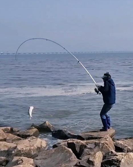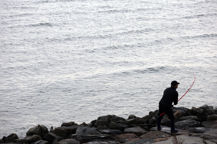 “으랏차!” 지난 2월 28일, 인천 영종도 인천대교 아래 석축으로 출조한 낚시인이 바늘로 숭어를 걸어내 들어 올리고 있다.