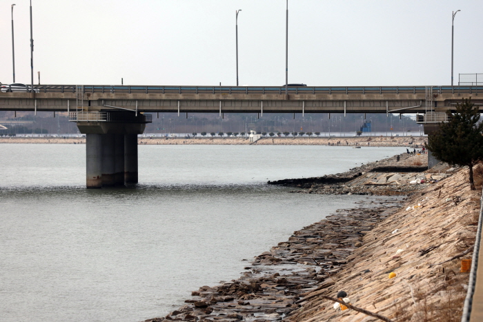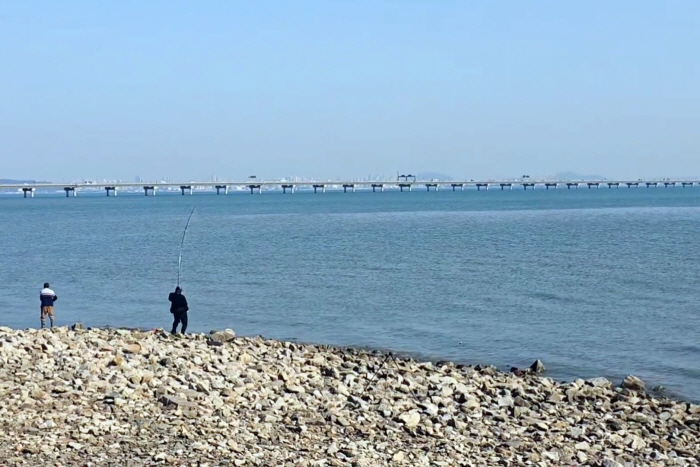 인천대교 아래 석축. 낚시할 수 있는 구간이 2km가 넘으며 하수가 흘러드는 자리가 인기 있다.