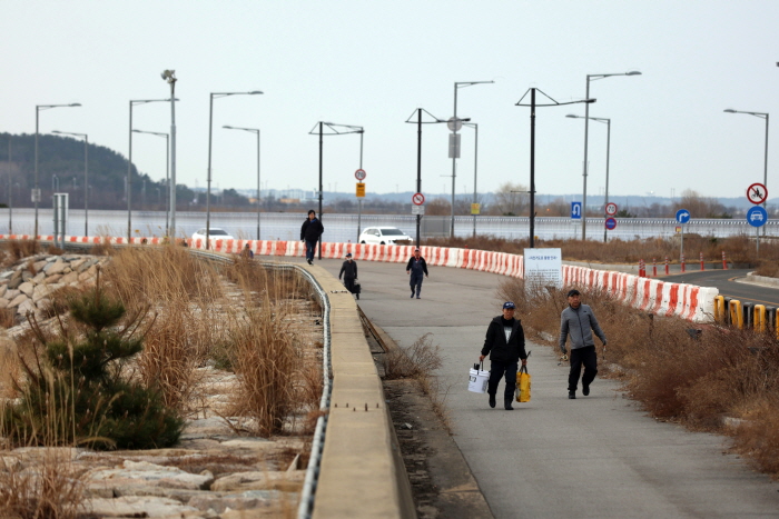 썰물이 시작되어 철수하는 낚시인들. 먼 거리를 걸어야 하기 때문에 휴대용 자전거나 킥보드를 이용하는 낚시인들이 많다.