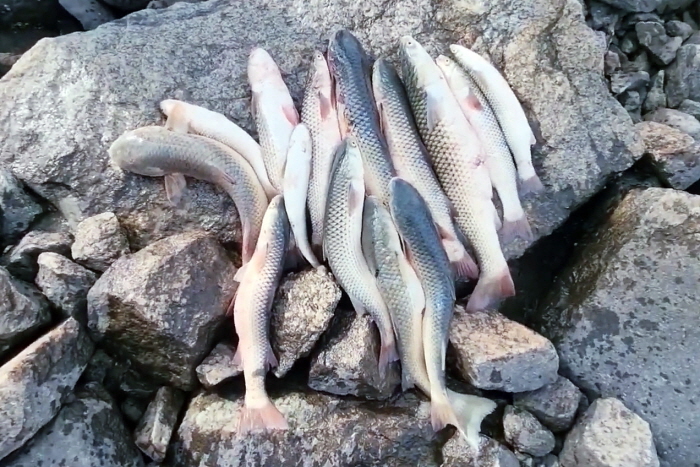 훌치기 동호인들이 거둔 숭어 조과. 만조 전후 두 시간 정도 낚시할 수 있지만 조과가 매우 뛰어나다.