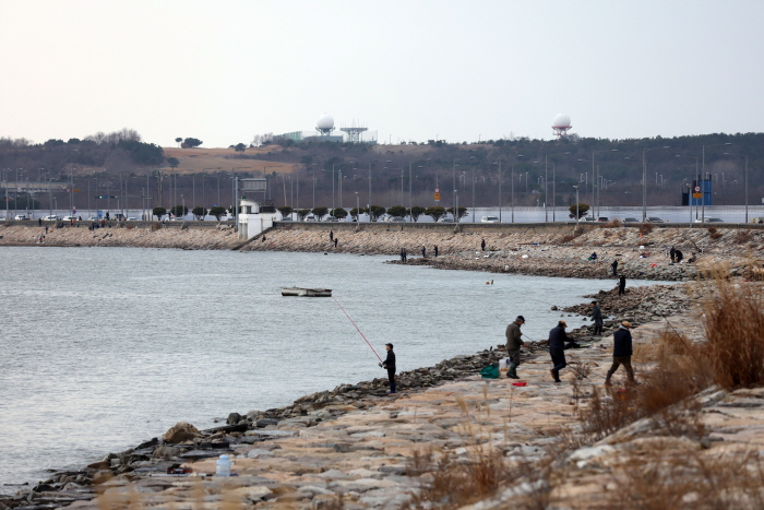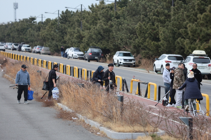 인천대교 아래 석축 연안 일대를 가득 메운 낚시인들.