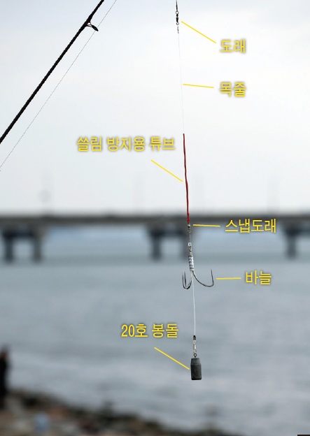 현지 훌치기 고수의 채비. 원줄에 도래를 연결해 10호 목줄을 묶은 후 목줄에 상처가 나지 않도록 고무 튜브를 끼웠다.
