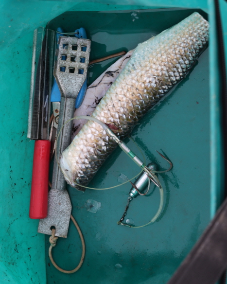 현지 낚시인의 보조 가방. 낚은 숭어는 비린내가 나기 때문에 비늘을 친 후 머리와 내장을 제거해 담는다.