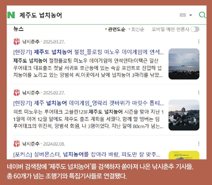 예를 들어 검색창에 ‘제주 넙치농어’를 입력하면 자료 사진에서 보듯 뉴스란의 상단 기사가 모조리 낚시춘추 기사로 ‘도배’ 되며 기사의 양도 60개 이상임을 알 수 있습니다. 따라서 낚시춘추 기사에서 언급된 낚시터, 노출된 장비와 채비, 소품은 물론 낚시의류, 낚싯배, 낚시점 등이 자연스럽게 네이버를 통해 홍보될 수 있습니다.